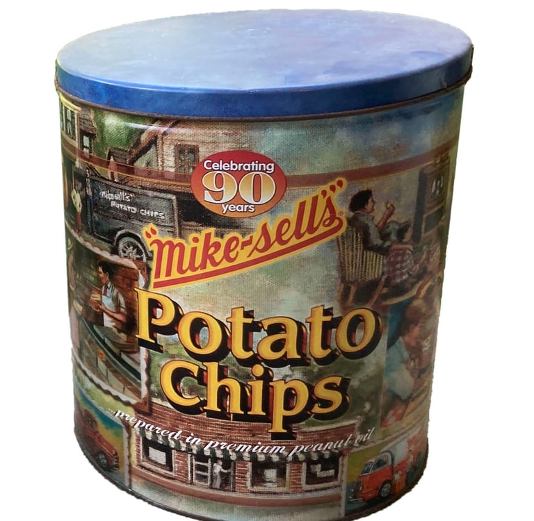 Item# AC4 Mike-sell Potato Chip Tin lid and can are like new. Measures 10"w x 12"h